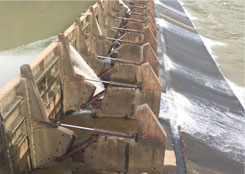 翻板壩阻水,經(jīng)不住洪水的沖擊,易被漂浮物卡塞或上游淤積造成不能自動(dòng)翻板,容易被洪水沖壞壩體影響防洪安全。洪水過(guò)后翻板門再關(guān)上時(shí)被異物卡住,造成大量漏水,一旦淤積厚度較大或泥沙板結(jié),閘門就不能正常回門(眾多閘門中只要有一扇),將影響河道正常蓄水。汛期漂浮物(特別是樹(shù)枝)經(jīng)常卡住閘門導(dǎo)致起翻或回落困難,威脅到行洪安全。